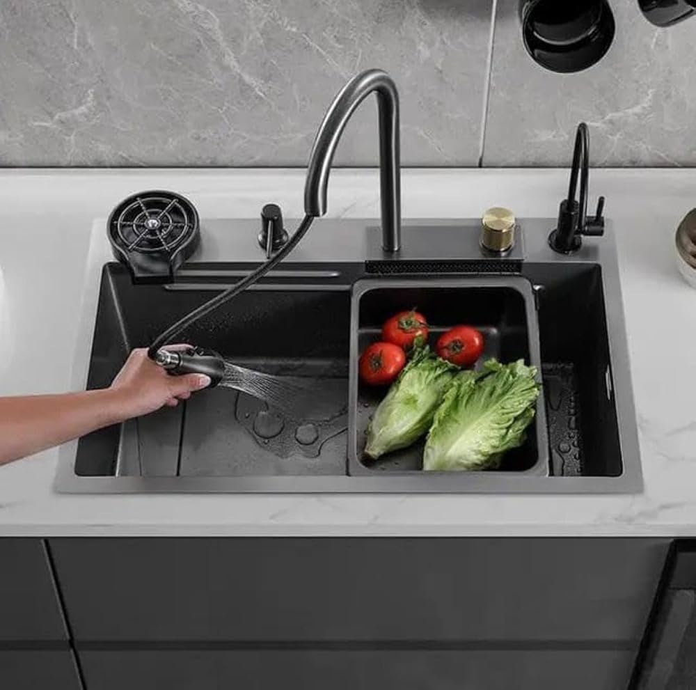 It is a sink system that integrates multiple functions and accessories into a single unit, often combining a sink bowl, faucet, and other features like rinse stations, drains, soap dispensers, etc., with a “waterfall” style faucet or flow. Here are the typical components and characteristics: