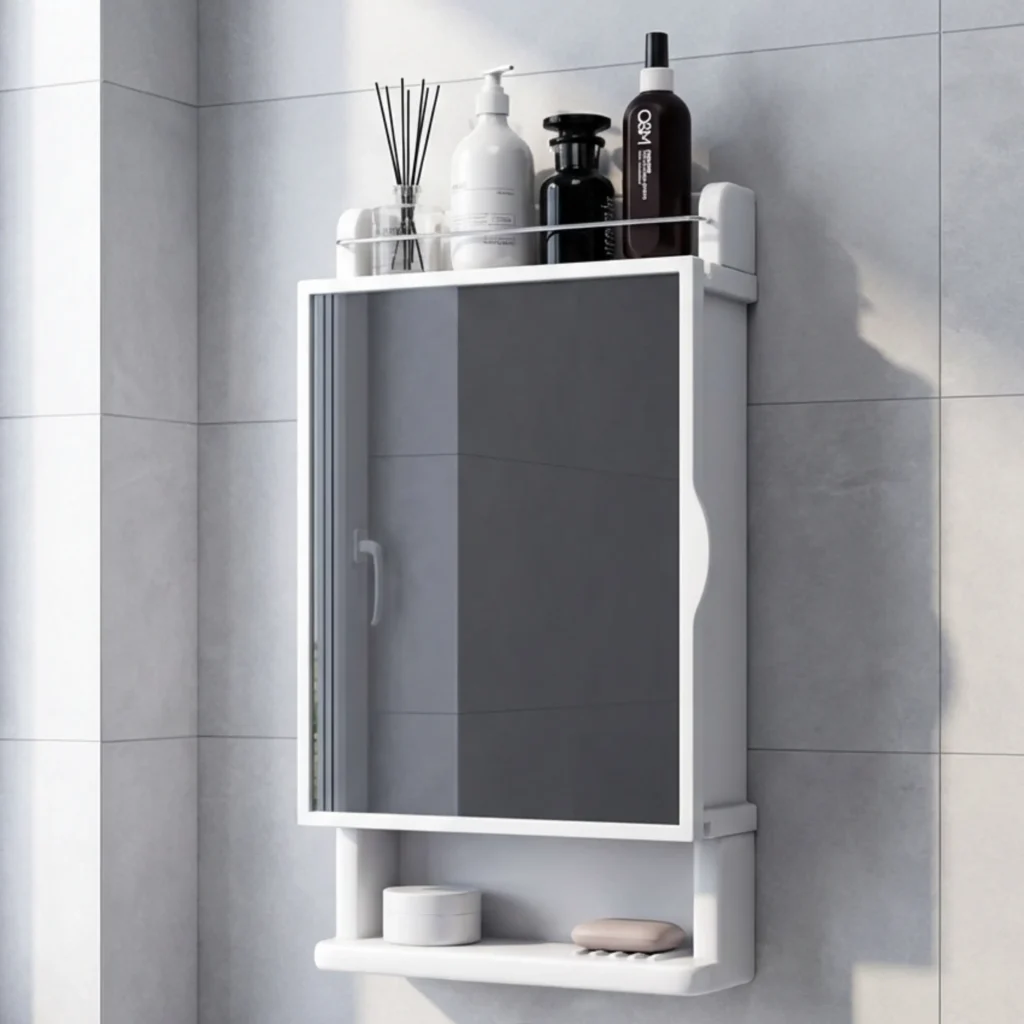 A PVC bathroom cabinet offers enclosed storage for toiletries and personal care products.